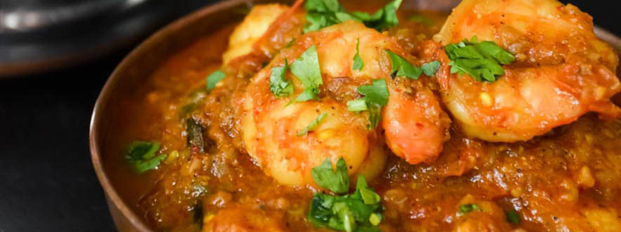 Marinoituja jattikatkarapuja, mausteita, sipulia, paprikaa ja tomaattia Tikka Masala kastikkeessa.Marinated king prawns with homemade spices, onion, capsicum and tomatoes in Tikka Masala sauce.